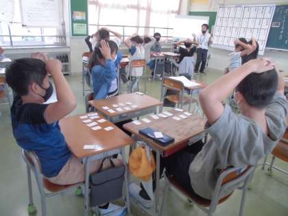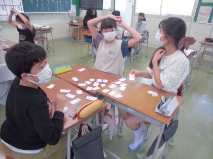 言葉の変化につい学習しました。例えば、「背広」が「スーツ」、「さじ」が「スプーン」という言葉で表されるようになっています。先生が言った言葉は何のことなのか、グループになってカルタ形式で楽しく学習しました。