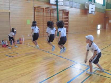 長縄は跳べる回数が増えてきています。側転は難しいですが、手を置く位置などを考えながら練習しています。フラフープは上手に回したり跳んだりできるようになってきています。今後の成長が楽しみです。