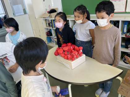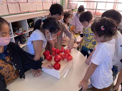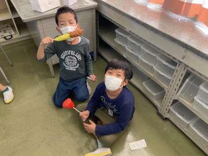 りんご・いちご飴、チョコバナナのコーナーです。本物そっくりに作ってあり、クオリティーが高いので、思わずみんな食べる真似をしました。