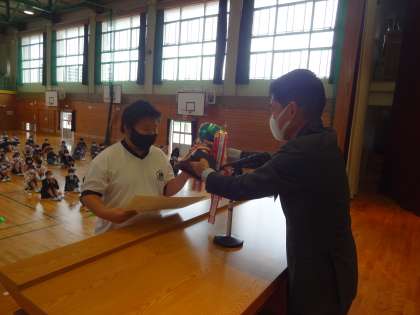 まず初めに、「第36回富山県相撲選手権大会 小学4年生 重量級の部」で優勝した児童の受賞紹介を行いました。全校のみんなで拍手して讃えました。