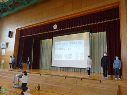 次に、運営委員が、「創校150周年記念学習発表会」のスローガンを発表しました。昨日の代表委員会で決定しました。「やる気いっぱい 笑顔をあふれる 学習発表会にしよう」です。一生懸命に練習して、ぜひ達成してほしいです。