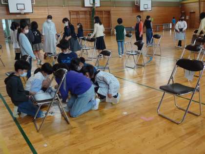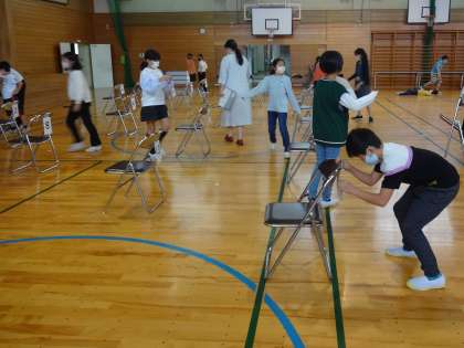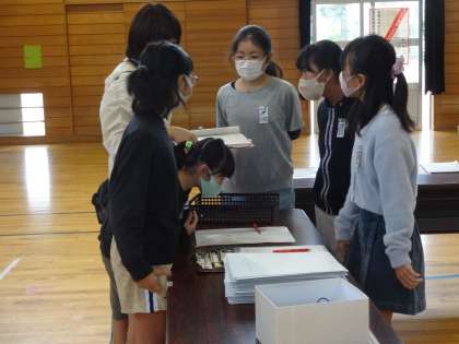 サンサンタイム(業間休憩)に、5年生の子供たちは、教職員と一緒に、就学時健康診断の準備をしました。