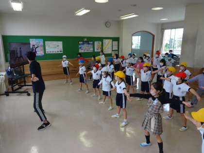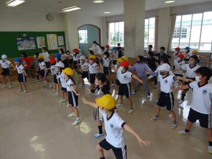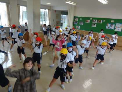 多目的室で、「南中ソーラン」の練習に一生懸命に取り組む子供たちです。