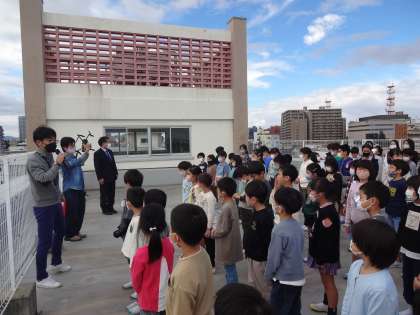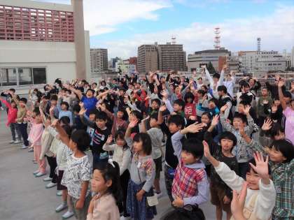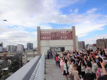 屋上に全員が整列し、ドローンを使って撮影しました。PTA会長さんとカメラマンさん(ドローンの操縦も)の指示に従い、カメラを見つめ手を振りました。