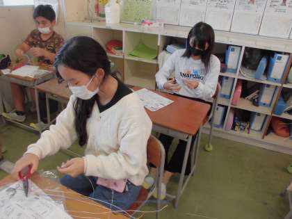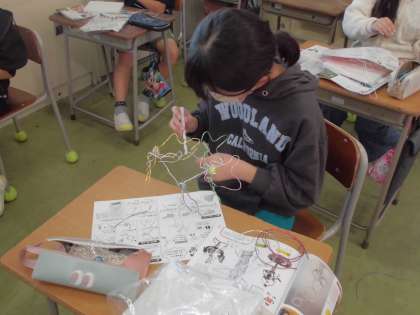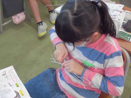 針金を使ったワイヤーアートの製作に取りかかりました。針金を切ったり、曲げたりして形を作り、最後は立ち上げた形で完成となります。今日は、自分のつくるデザインを考えましたが、なかなか思い浮かばずに苦労している児童もいました。