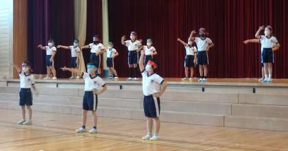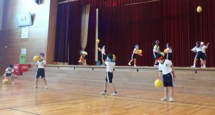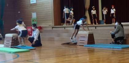 前半は、跳び箱運動、マット運動、リズムダンス、ボールを使った運動を披露しました。