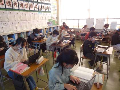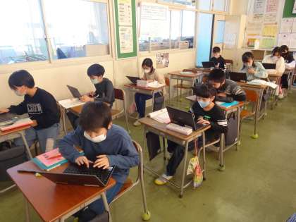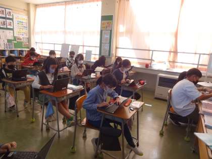 その議題で話し合うために、一人一人が方策を考え、クロームブックでまとめています。クロームブックでは、自分の考えを入力しながら、友達の考えも見ることができます。