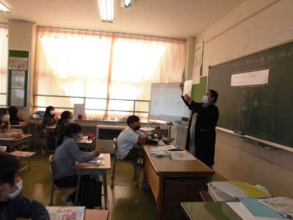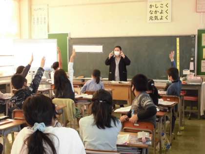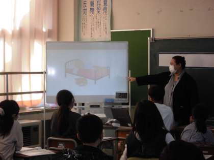 on,in,under,byを使って、物の位置を表す言い方を学習しました。ALTお手製のパワーポイントに一瞬だけうつされる絵を見て、物の位置を言い当てるゲームでは、とても盛り上がりました。楽しみながら表現に慣れ親しむことができました。