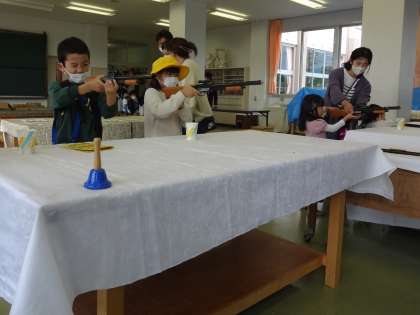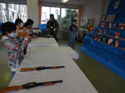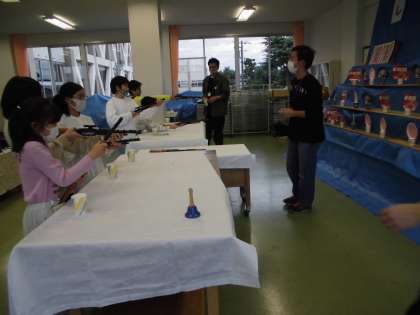 図工室では、射的をしました。学年によって、距離を変えて撃つことができました。なかなかのすばらしい腕前をもった子供が、何人もいました。