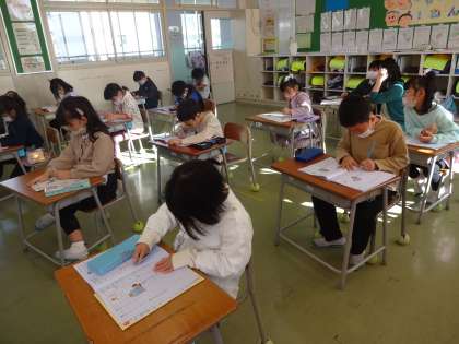 みんなで空書きをしてから、漢字練習です。「上」を書きました。
