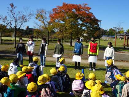 全校児童が安全に遊ぶために、運営委員会のメンバーが遊ぶときの注意事項を説明してくれました。