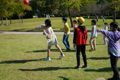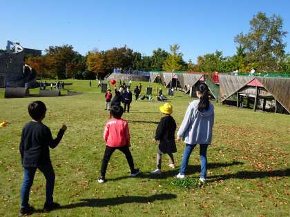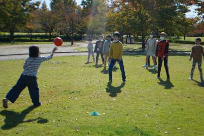 ドッジボールをしている様子です。ボールを2つ使うなど、工夫して楽しんでいるグループもありました。