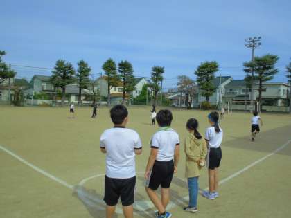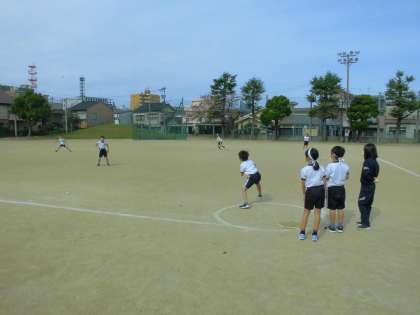 三角ベースボールをしました。バットの代わりに手でボールをコートに投げ入れました。守備についた子供は、必死に守り、ナイスキャッチも見られました。