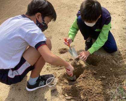 シャベルやスコップを使ってグラウンドの土を掘り土を採取しています。掘り進めると、オレンジ色の砂や黒い砂などが地層のようにしま模様になっていました。また、掘る場所によって、土の色が違っているところもあり、新たな発見もありました。次回は、採取した土を顕微鏡で観察します。