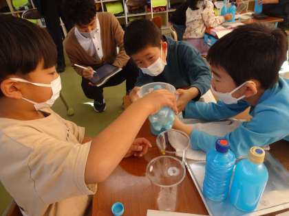 同じ大きさの容器に水を移して、高さを比べて分かりました。