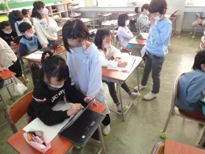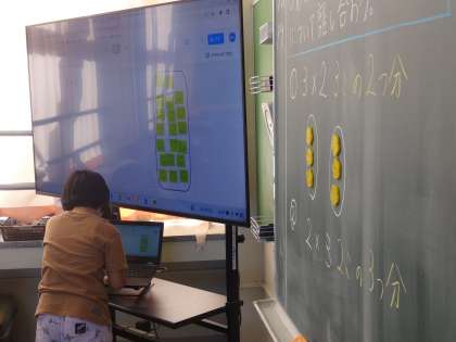 クロームブックの画面上で、おはじきを操作し、線で囲むなどして、考え方をまとめています。友達と相談する姿も見られました。
