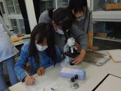 見た目では分かりませんが、顕微鏡で見ると、採取した物の色、形、大きさが異なることが分かりました。
