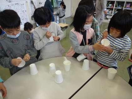 紙コップに穴を空け、輪ゴムを通し、切ったつまようじとセロハンテープで留めました。それをもう一つのコップにかぶせて飛ばします。
