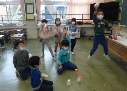 今日は、ゴムの力で動くおもちゃ「ぴょんコップ」を作りました。