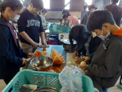 サイレント野外炊飯が始まりました。声を出さずに心を通わせて作らなければならないので、各班のチームワークが大切です。