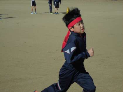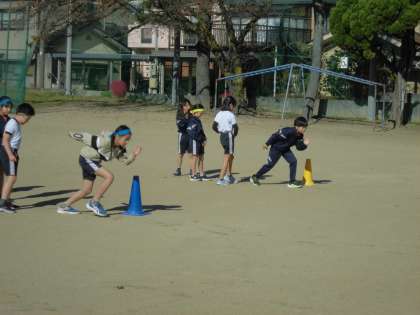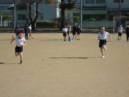 グラウンドで短距離走を行いました。コーンとコーンの間を25mに設定して、片道ダッシュ、往復ダッシュ等を行いました。快晴なので、子供たちも楽しそうに走りました。