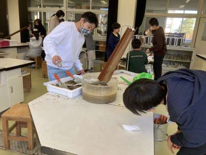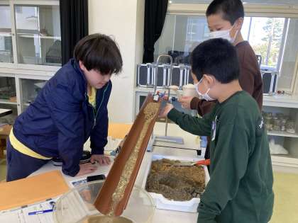 砂と水を使って、班ごとに地層を作りました。堆積の仕方が分かるように色の違う砂を使い分けて、観察しました。