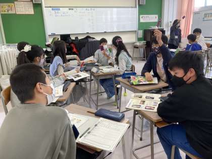 ハンガリー舞曲第5番を聴いています。旋律を繰り返しているところや旋律の変化が分かったら、カードを上げます。グループに分かれて旋律の変化を互いに確認しました。