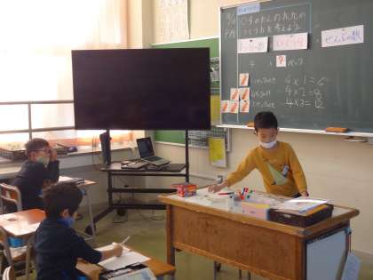 かけ算「4のだん」の九九の学習です。4個入りのみかんを何パック買うと何個になるかを、絵のヒントを見ながら式を考えています。