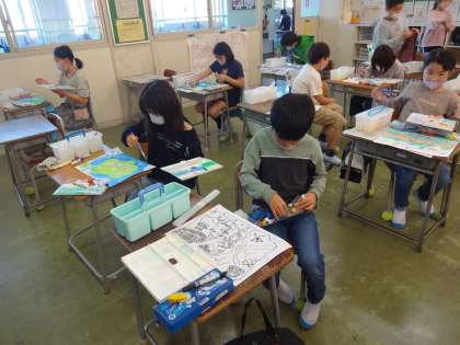 国語科の物語をつくる学習「たから島のぼうけん」に関連して、「たから島の地図」を描いています。