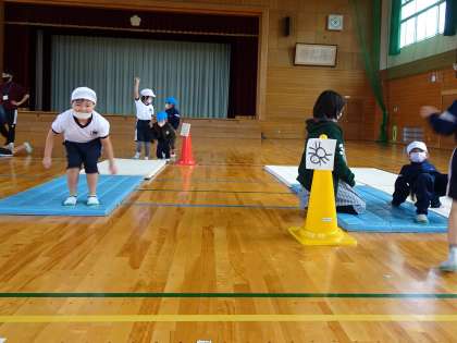 「犬走り」「わに歩き」「くま歩き」「うさぎ跳び」「くも歩き」のコースを順番に巡り、楽しみながら運動しています。