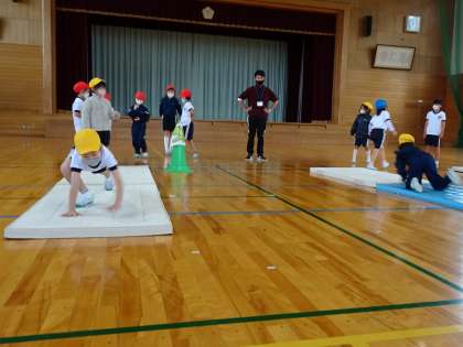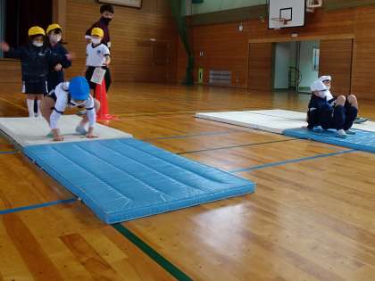富山市小学校スポーツ推進連盟体力つくり事業「チャレンジキッズわざ7」の「マット遊び・動物歩き」に挑戦しています。