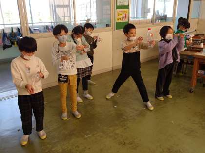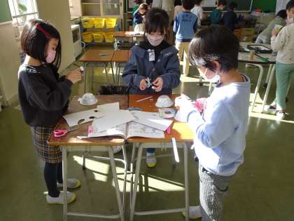 コトコト車、ぱっちんがえる、ゴムロケット、ピョンコップ、ビュンビュンカー、ストローアーチェリーの中から、自分が作りたいおもちゃを夢中になって作っています。