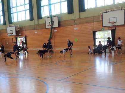けがをしないように、ウサギ跳びや、体幹を鍛える手押し車、飛び上がり飛び下り等の準備運動を入念に行いました。