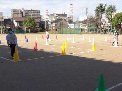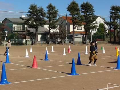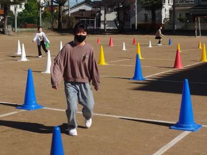 写真は、「目印ダッシュの練習」の様子です。一人一人の動く速さが違うので、指示を出すタイミングに苦労しましたが、設定時間内に終えることができました。