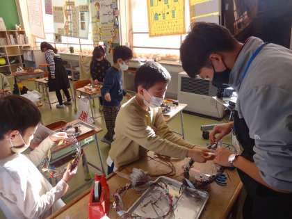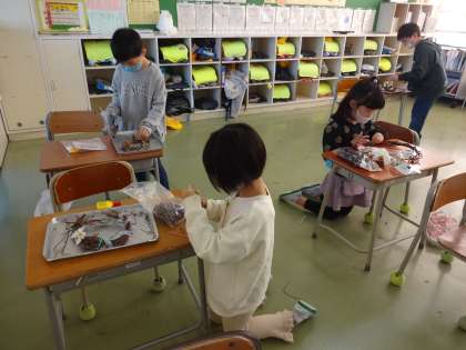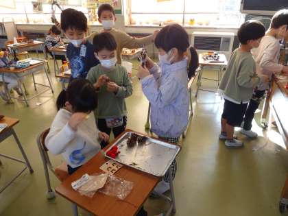 自分で育てたアサガオのつるを使って、リース作りをしています。飾り付けに使う木の実やモール等の材料は、ほとんど自分で用意しました。