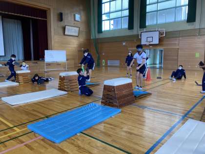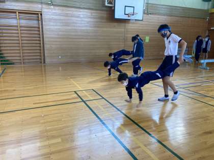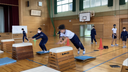 跳び箱運動につながる準備体操を行い、大きな開脚跳びに挑戦しました。クロームブックで撮影して、フォームを確認しながら目指す跳び方を習得するために練習しています。