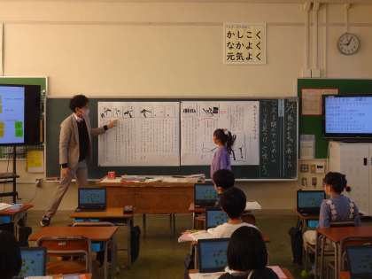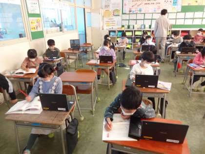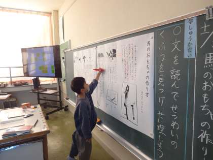 説明文「馬のおもちゃの作り方」を読み、いくつのまとまりから文章が成り立っているかを考えました。クロームブックと教科書の両方を使いながらの学習です。