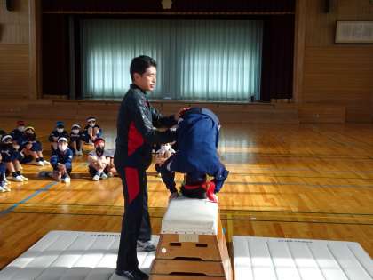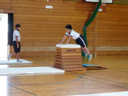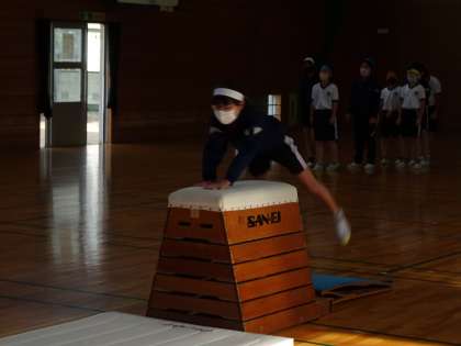 開脚跳びをした後に、校長先生から台上前転のコツを教えていただきました。その後台上前転に挑戦した児童は、みんなできるようになりました。開脚跳びも、校長先生の個別指導もあって、5年生全員が跳べるようになりました。全員笑顔で体育を終えました。
