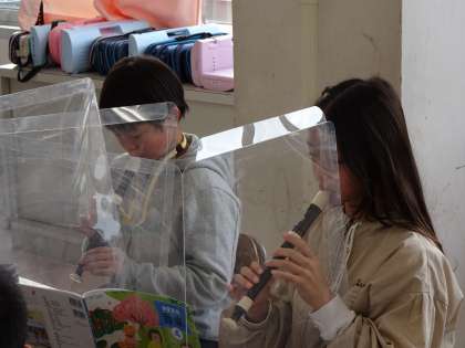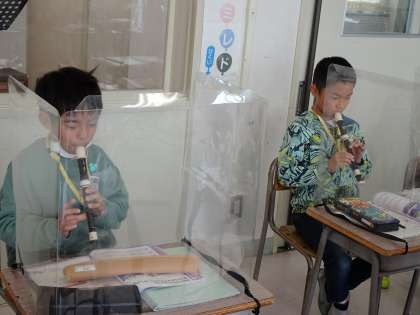 スタッカート(短く切る)ことを意識して、リコーダーで「陽気な船長」を演奏しました。ペアで発表しましたが、タンギングを鋭くしているので、一人で演奏しているように聞こえました。