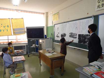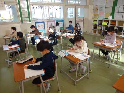 説明文「じどう車くらべ」を読んで、いろいろな車の「仕事」と「つくり」について、文章のどこに書いてあるのかを見付けています。友達の発表を聞きながら、自分の考えと比べています。