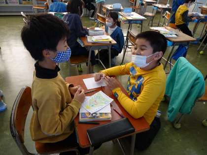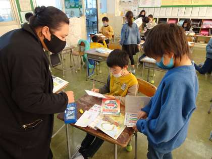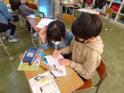 ○、△、□等の図形が何個あると、何ができあがるか自分で考え、相手に伝えて想像してもらうゲームをしました。英語で伝えて、相手に想像してもらうので難しいですが、楽しく取り組めました。