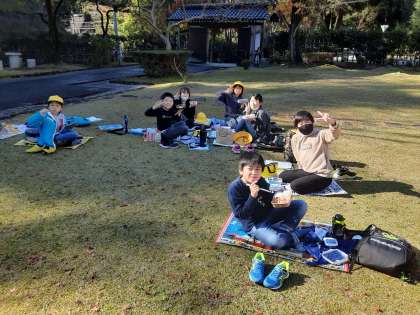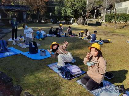 民族民芸村に到着し、陶芸館の芝生の上で昼食タイムです。昨日から天候が回復し、青空の下で楽しく食べることができました。