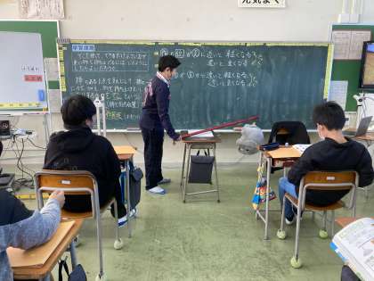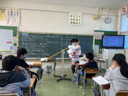 てこが水平につり合うときには、どのような決まりがあるのか人形を使って考えました。支点から、遠い位置に人形を吊るしたり、近い位置に吊るしたりして、傾きを見ながら実験しました。
