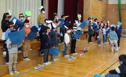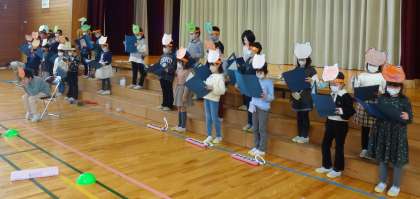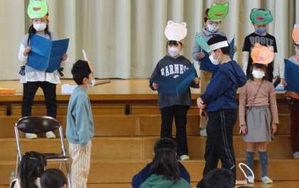 今日は、2年生が発表しました。国語科物語文「お手紙」で行った音読、図画工作科で取り組んだ「手作り楽器」、音楽科で練習した「山のポルカ」の演奏と、3つの学習を組み合わせて発表しました。