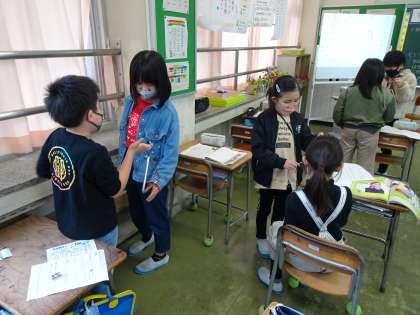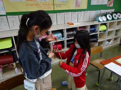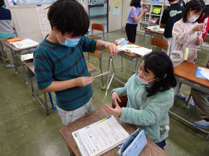 音が出るときにものが震えているかどうか調べるために、トライアングルに紙を付けて音を鳴らす実験をしました。「すごく震えてる」「さわってみて」などの言葉が聞こえ、何回も繰り返してみるなど、意欲的に取り組みました。