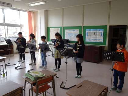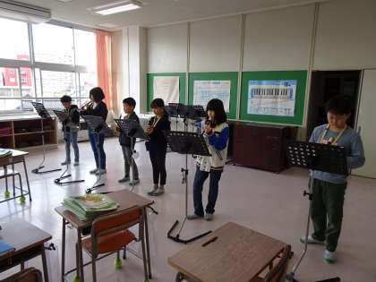 息の使い方に気をつけて、「陽気な船長」の曲を、6人でリレー奏しました。