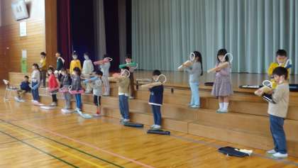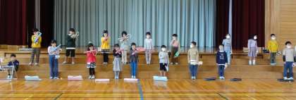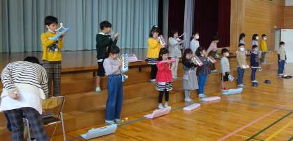 体育館のステージで練習をしているのは、「なかよし」という曲です。