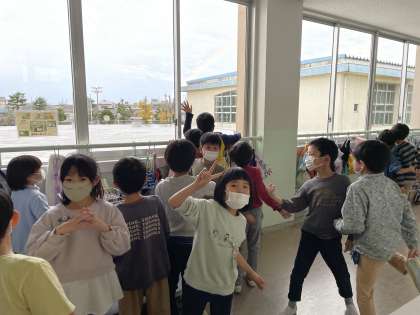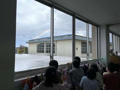 5時間目の学習中に給食のお姉さんが「虹が出ているよ」と教えてくれたのでみんなで見に行きました。きれいな虹にみんなで感動していました。心がきれいな子供たちには、虹が二重で見えたそうです。ちなみに先生には普通の虹にしか見えませんでした。