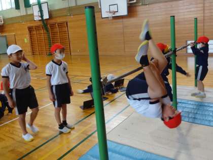 子供たちは、鉄棒遊びに意欲的に取り組んでいます。友達の技を見たり、応援したりしながら順番待ちしている子供たちの様子から、早くやりたいという気持ちが伝わってきました。