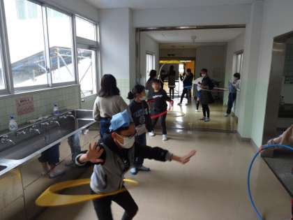 2枚目は、体育館が空くのを待つ間、廊下でフープを回して遊ぶ子供たちの様子です。